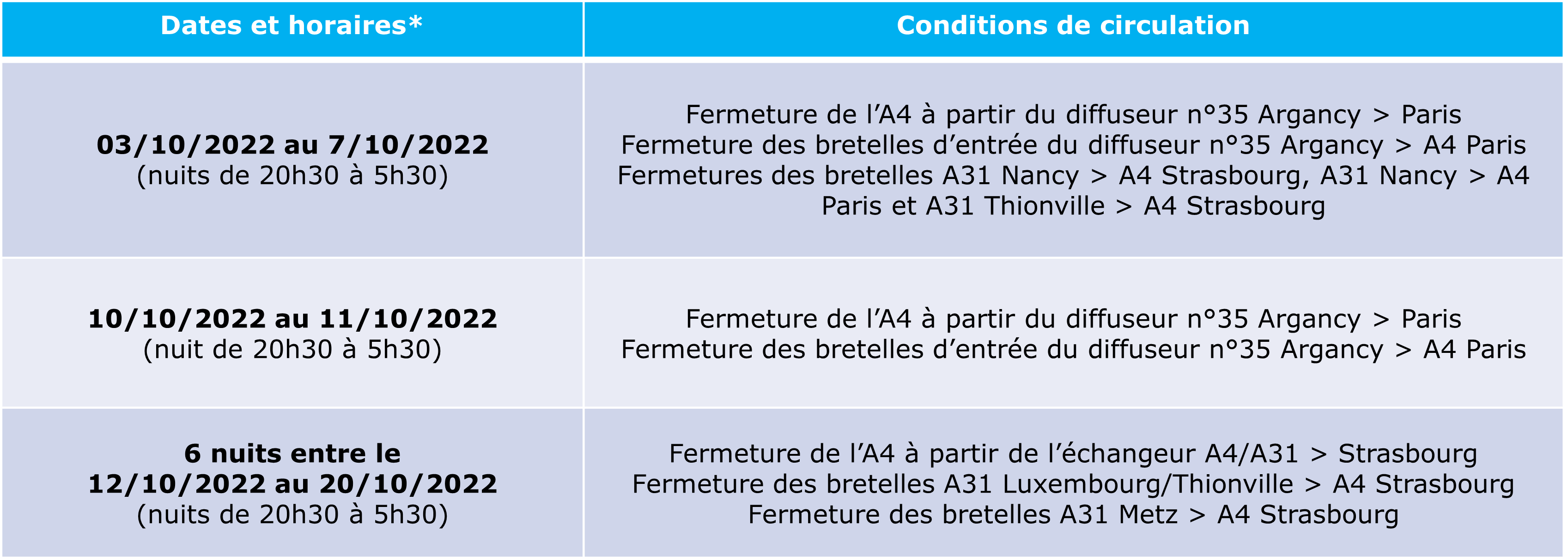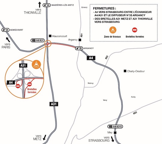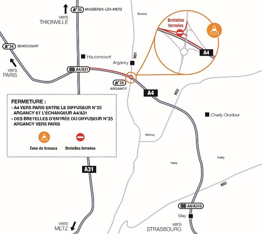 Fermeture de l’A4 vers Paris à partir du diffuseur n°35 Argancy les nuits du 3 au 7/10 et du 10 au 11/10 de 20h30 à 5h30*