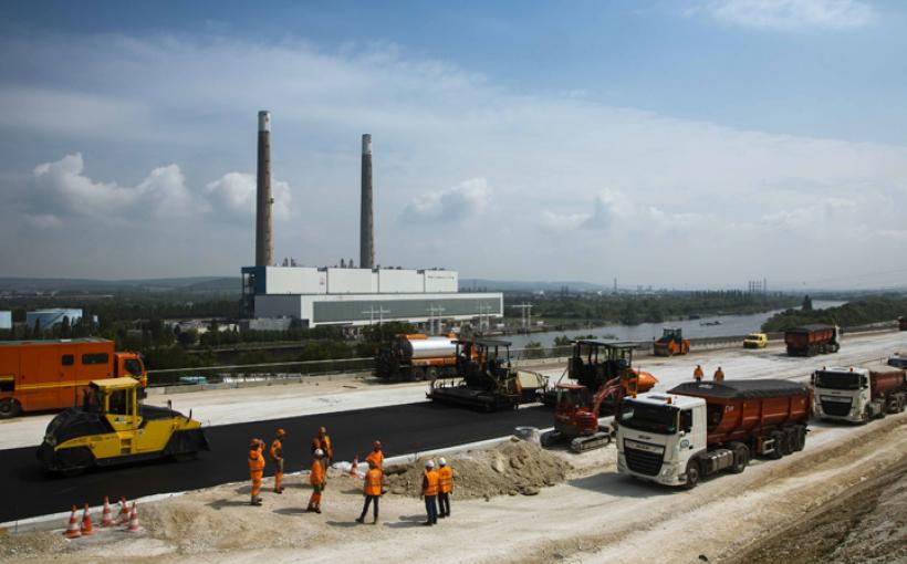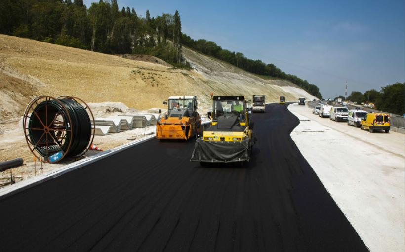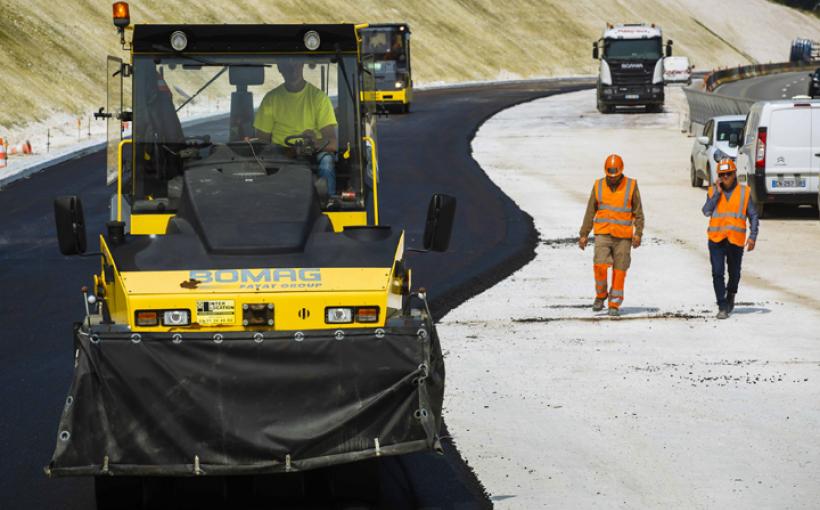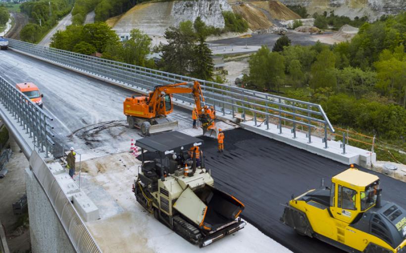 On y est presque ! Après la phase de coffrage et de bétonnage du tablier, les équipes Sapn/Sanef commencent la mise en place de l'enrobé sur l'ouvrage entier.