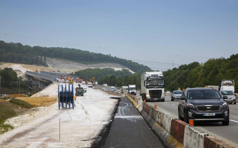 Le chantier de construction du 3e tablier du viaduc de Guerville sur A13 avec une nouvelle phase : l'enrobé.