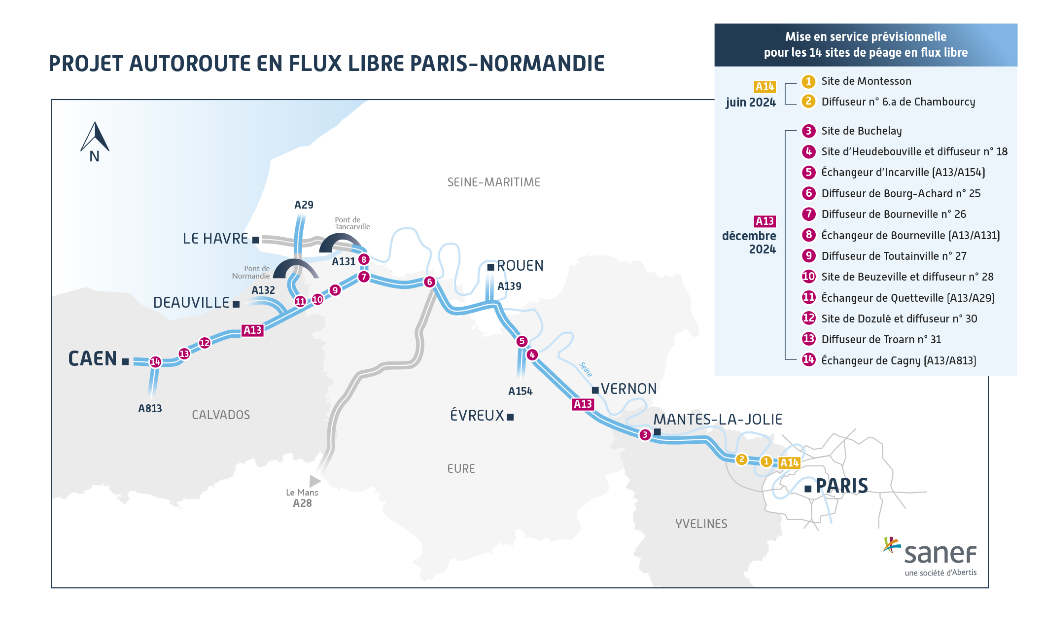 En juin pour l’A14 et décembre 2024 pour l’A13, les 210km qui relient Paris à Caen seront le premier axe autoroutier français historique à se doter de la technologie du péage en flux libre. Nos clients circuleront alors entre l’Ile-de-France et la Normandie sans rencontrer de barrières de péage. Leur véhicule sera identifié en passant sous des portiques, sans réduction de la vitesse, et le montant du péage à acquitter sera automatiquement calculé.