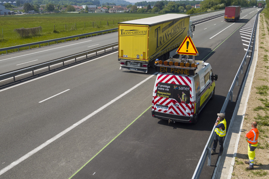 Panneaux de chantier, signalisation lumineuse des véhicules d’intervention, panneaux à messages variables, annonces à l’antenne de radio Sanef 107.7 : vous êtes toujours avertis de la présence de nos équipes sur le terrain. Ne vous laissez pas surprendre !